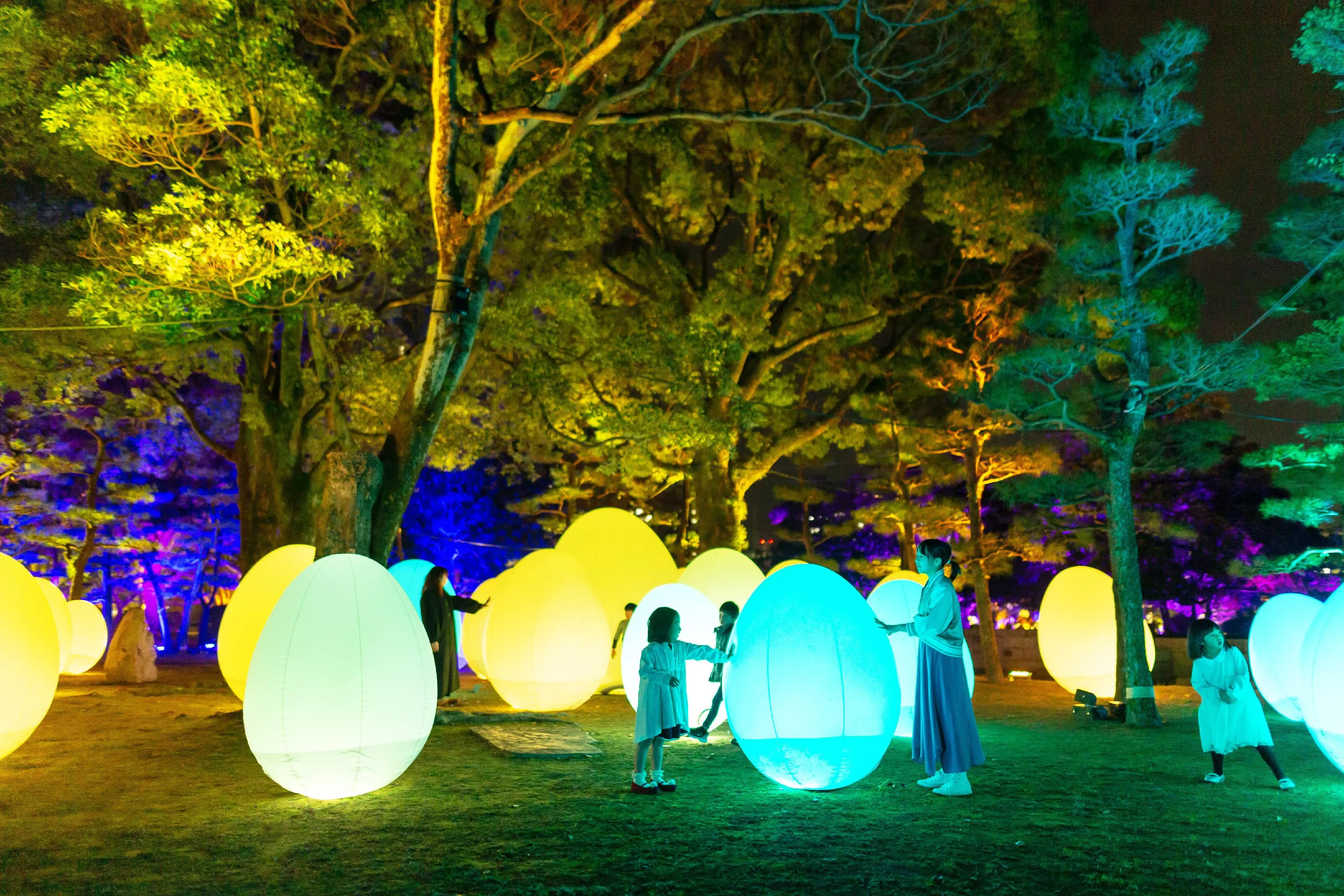 When the ovoid is pushed, the colour of the light it emits changes and the tone unique to that color echos. The light originated from that ovoid resonates out to other ovoids and trees nearby. The tone resonates out continuously in the same way as the light, spreading throughout the ovoids, trees and all the way out to Resonating Hiroshima Castle.