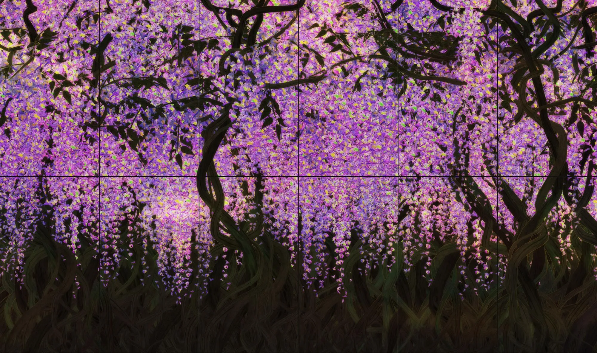 The space of the artwork is created with what teamLab refers to as Ultrasubjective Space. In contrast to spaces that are created through, or in other words cut out by, lenses and perspective, Ultrasubjective Space does not fix the viewer’s viewpoint and in turn frees the body. The wall that the flowers are seen on does not become a boundary between the viewer and the artwork, and the artwork space is continuous with the space of the viewer’s body.