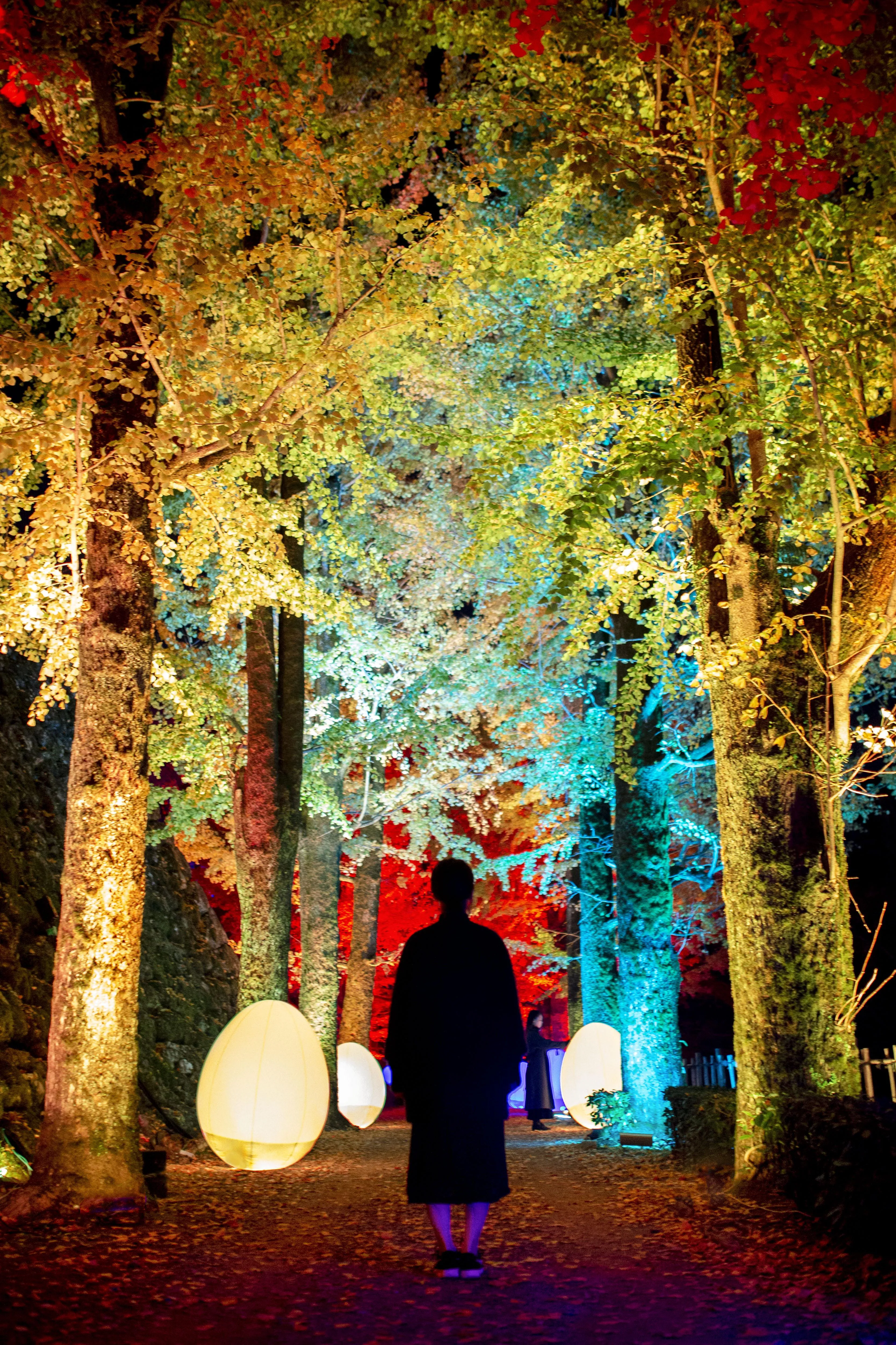 放置在古城遺跡中的持續不斷站立的物體和遺跡中的樹木一起發出光芒。