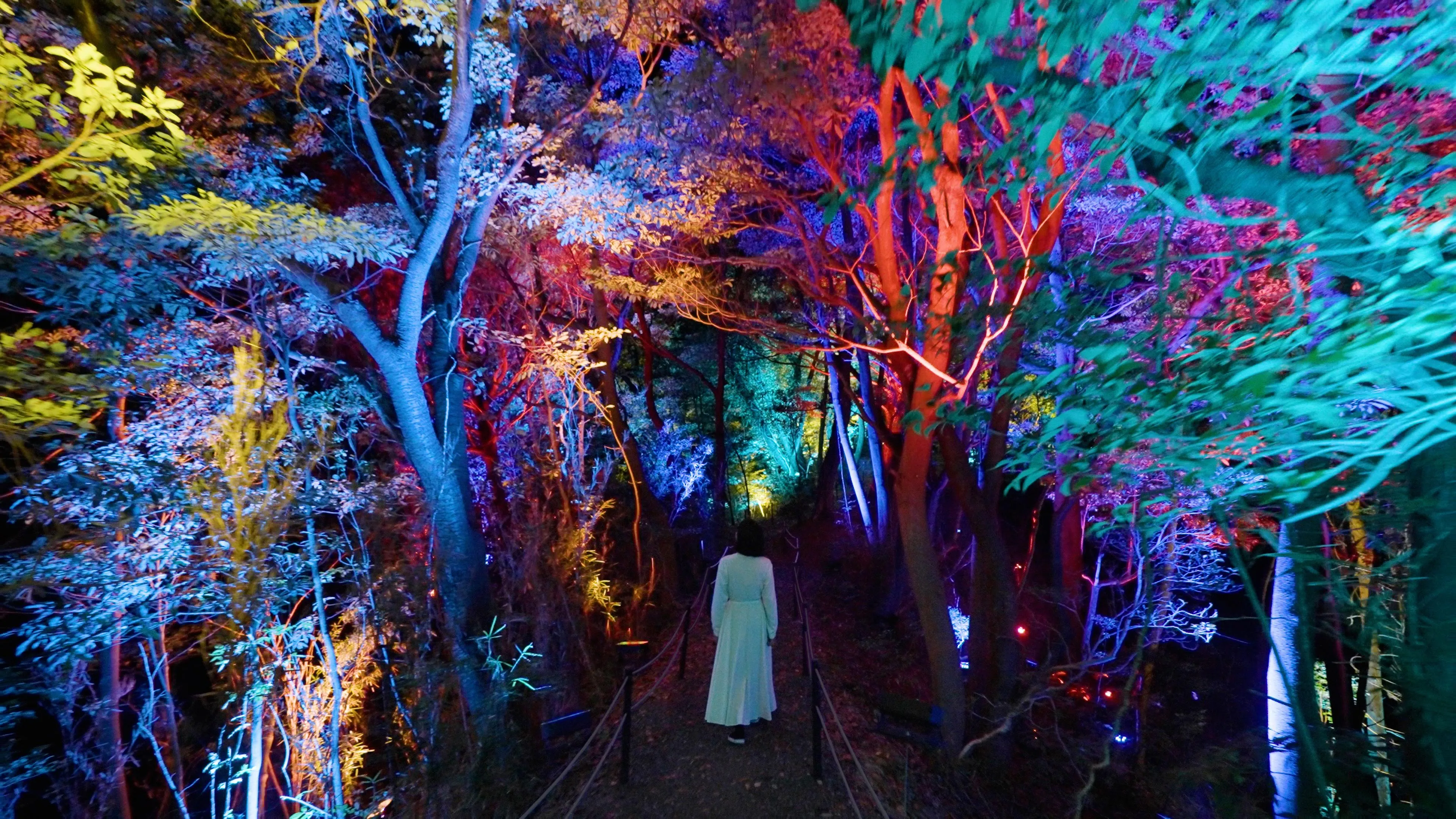 When people or animals pass close to the trees, the trees shine brightly and produce a tone. That light and tone then spreads out continuously, one by one, to the surrounding trees.