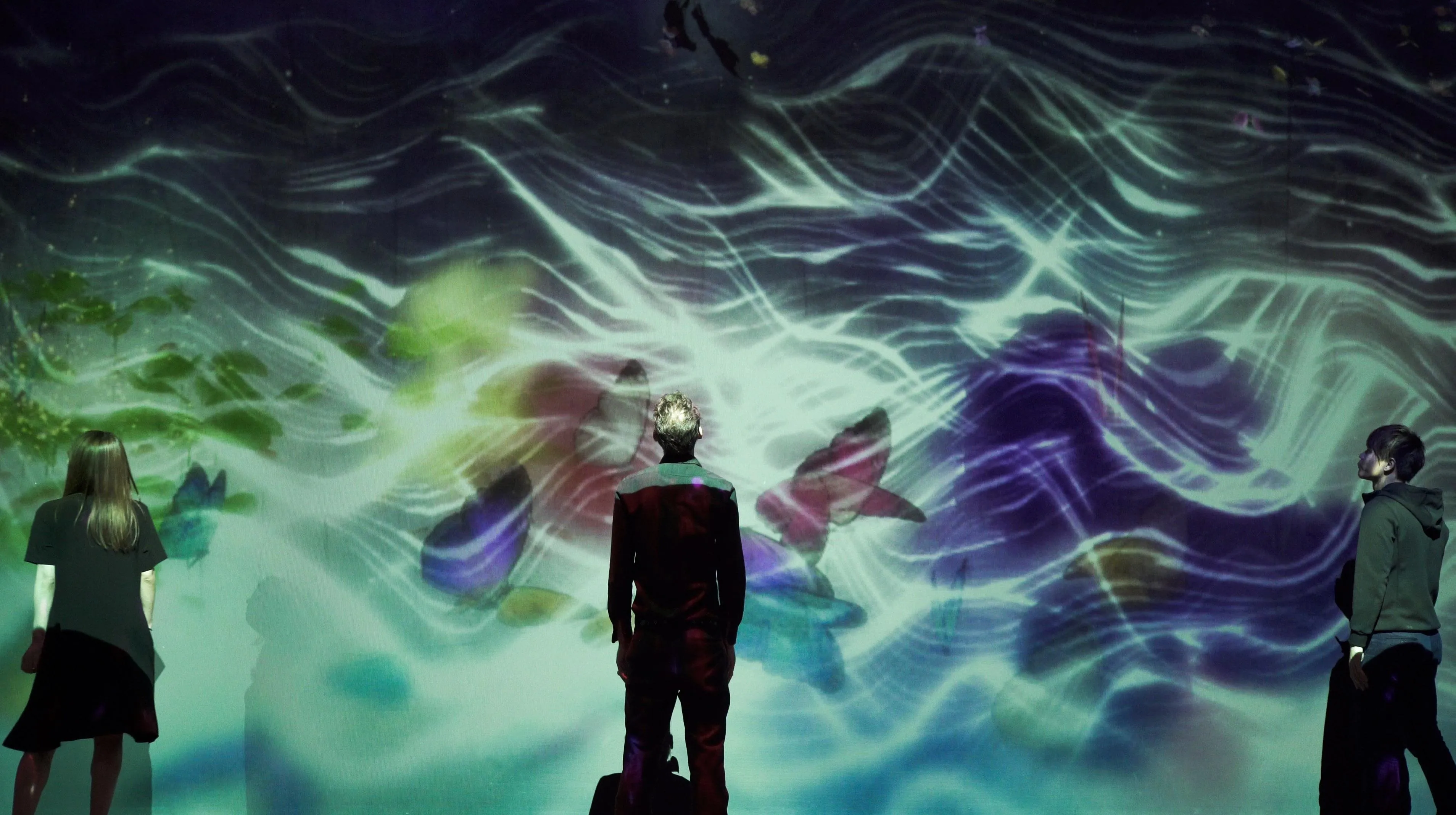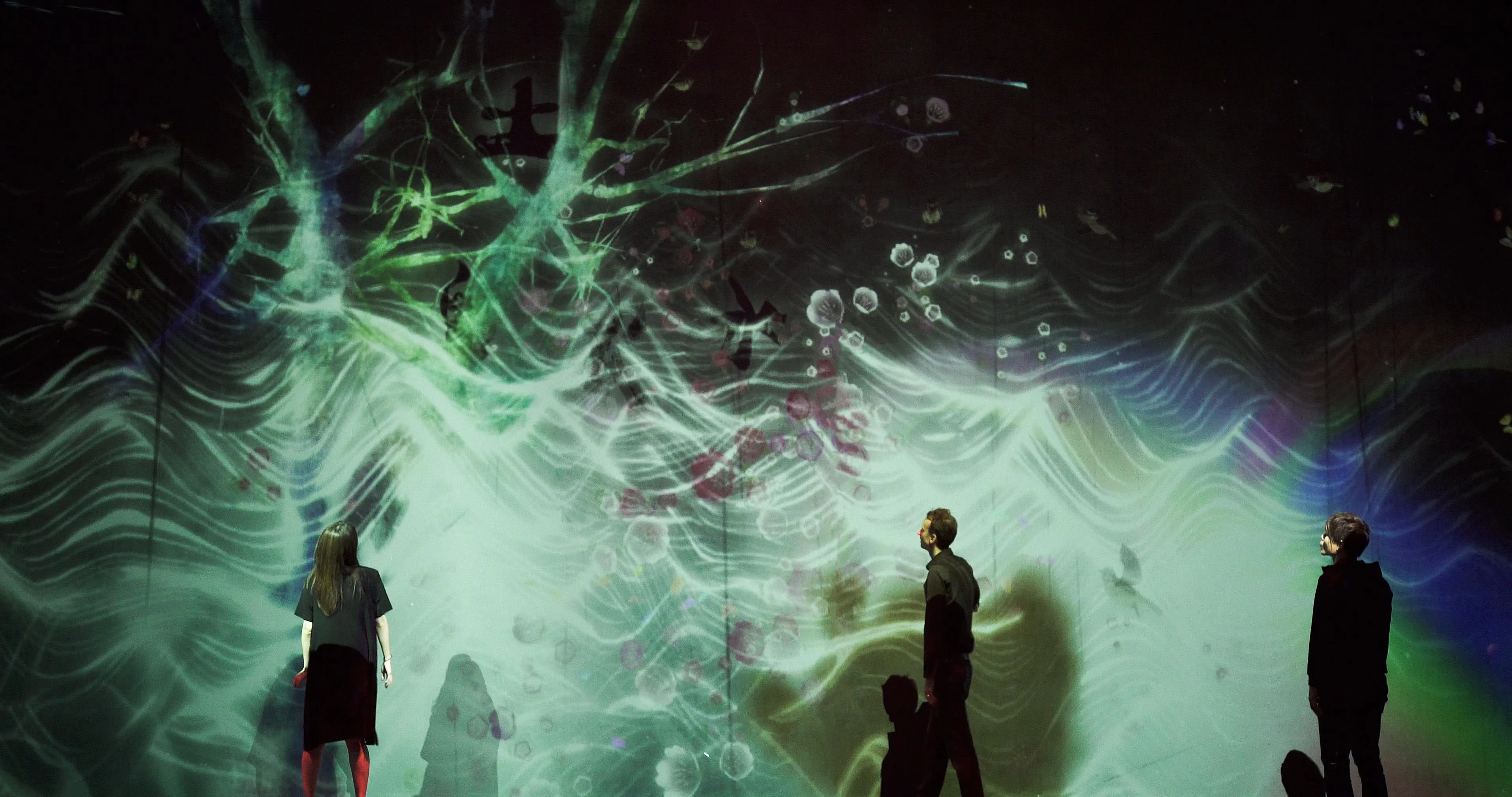同時,也受到其他作品的影響。比如,”被追逐的八咫鳥、追逐同時亦被追逐的八咫鳥、超越空間”的八咫鳥飛來並觸碰到漢字時,也同樣會展現出漢字裡所蘊含的世界。從漢字裡衍生的事物,受到作品空間上各自的位置,以及所持有的智能和關系性,物理作用力的相互影響,進而創造出一個世界。比如,有風吹過時,花和雪受到風的物理影響,飛散開來。鳥兒在樹 木上駐足,蝴蝶天性愛好花朵。就像自然風景,沒有完全重複的瞬間一樣,當下的這個瞬間,呈現出來 的作品也不會出現第二次。