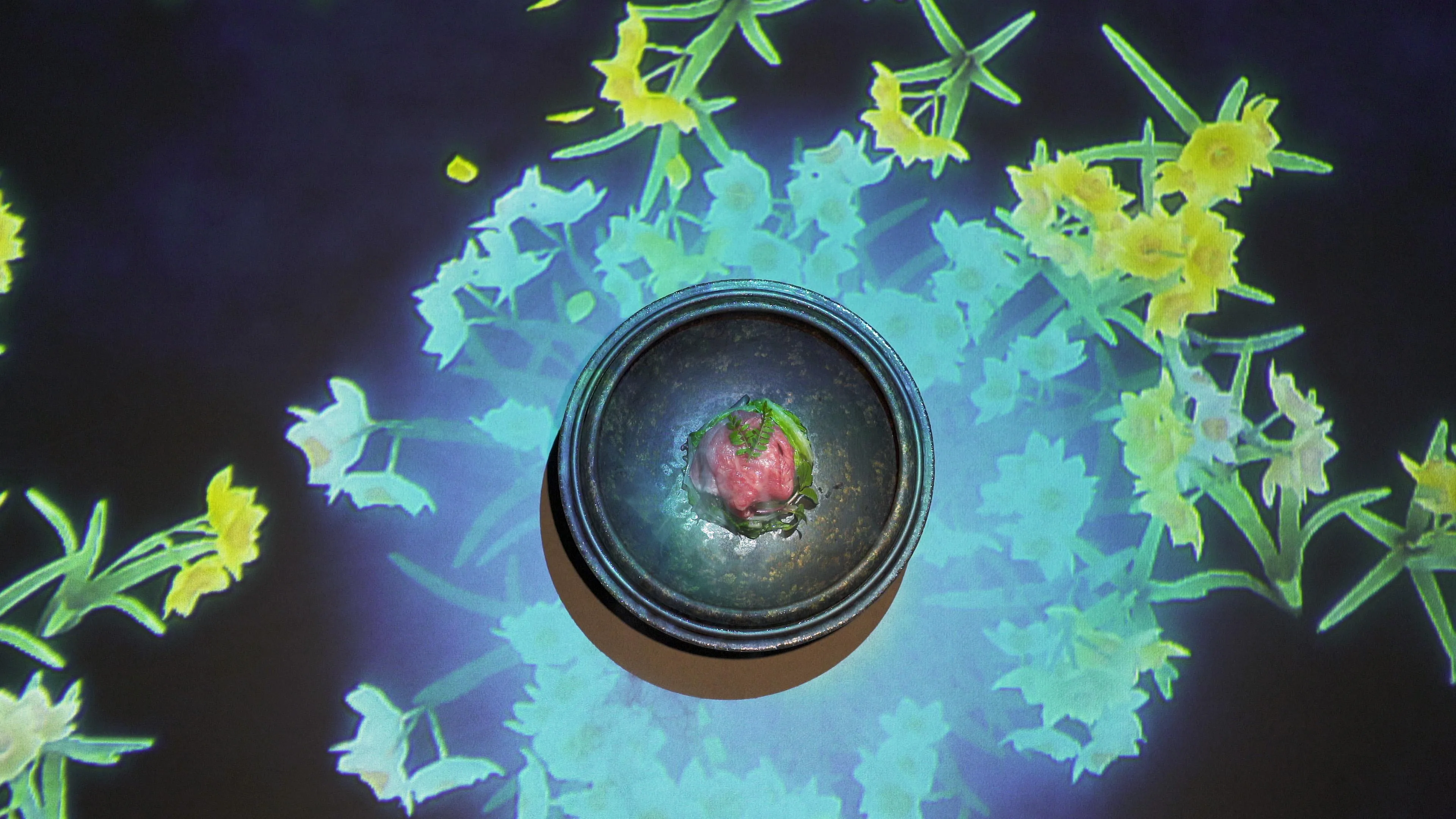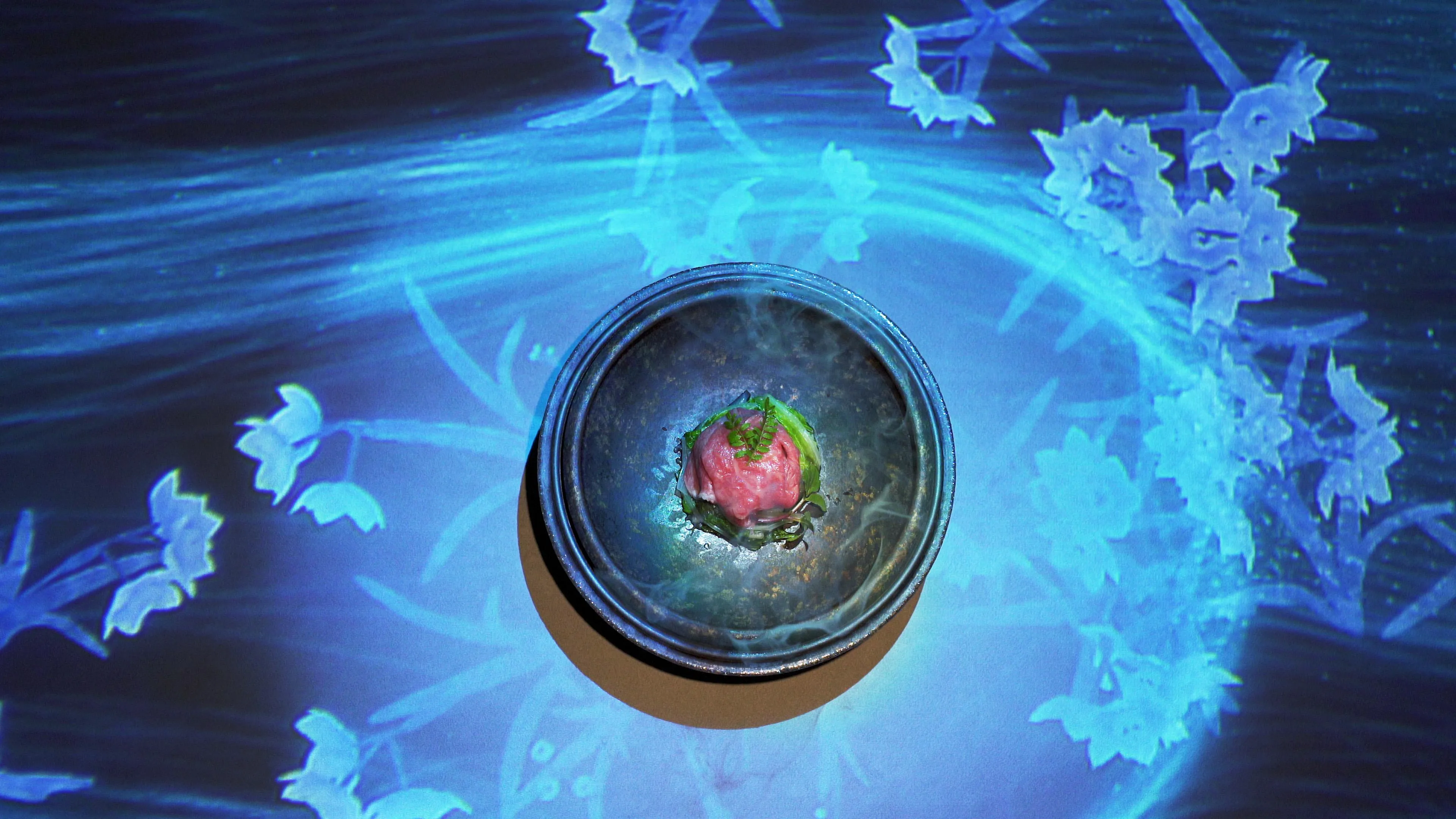 當料理與器皿被放置在在桌上時,原本濃縮封閉在那個料理與器皿內的世界會被釋放出來,然後延展到桌子以及整個空間裡。當從料理與器皿中釋放出來的世界彼此相連時,就會在整體空間裡建構出一個全新的世界。
