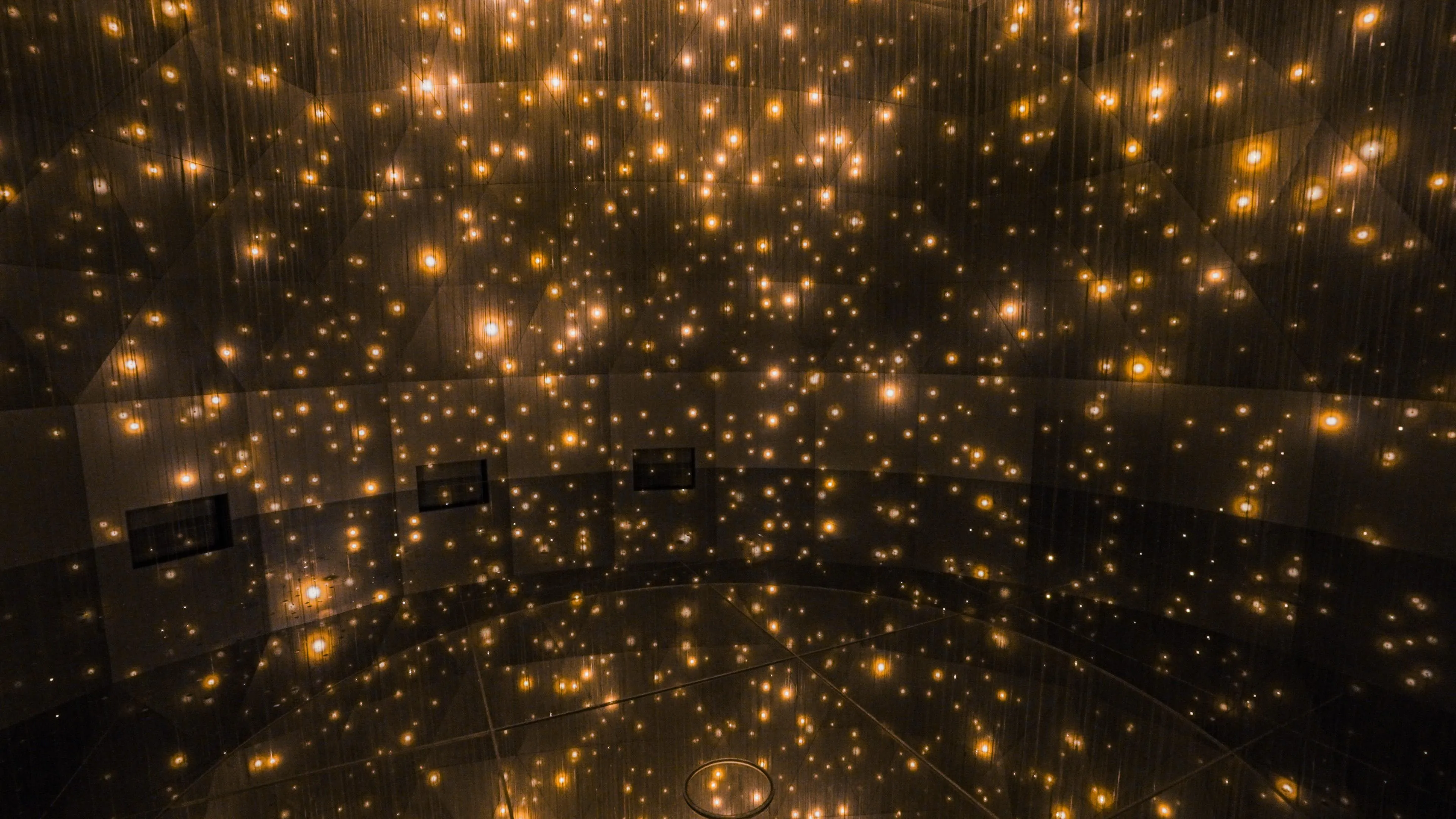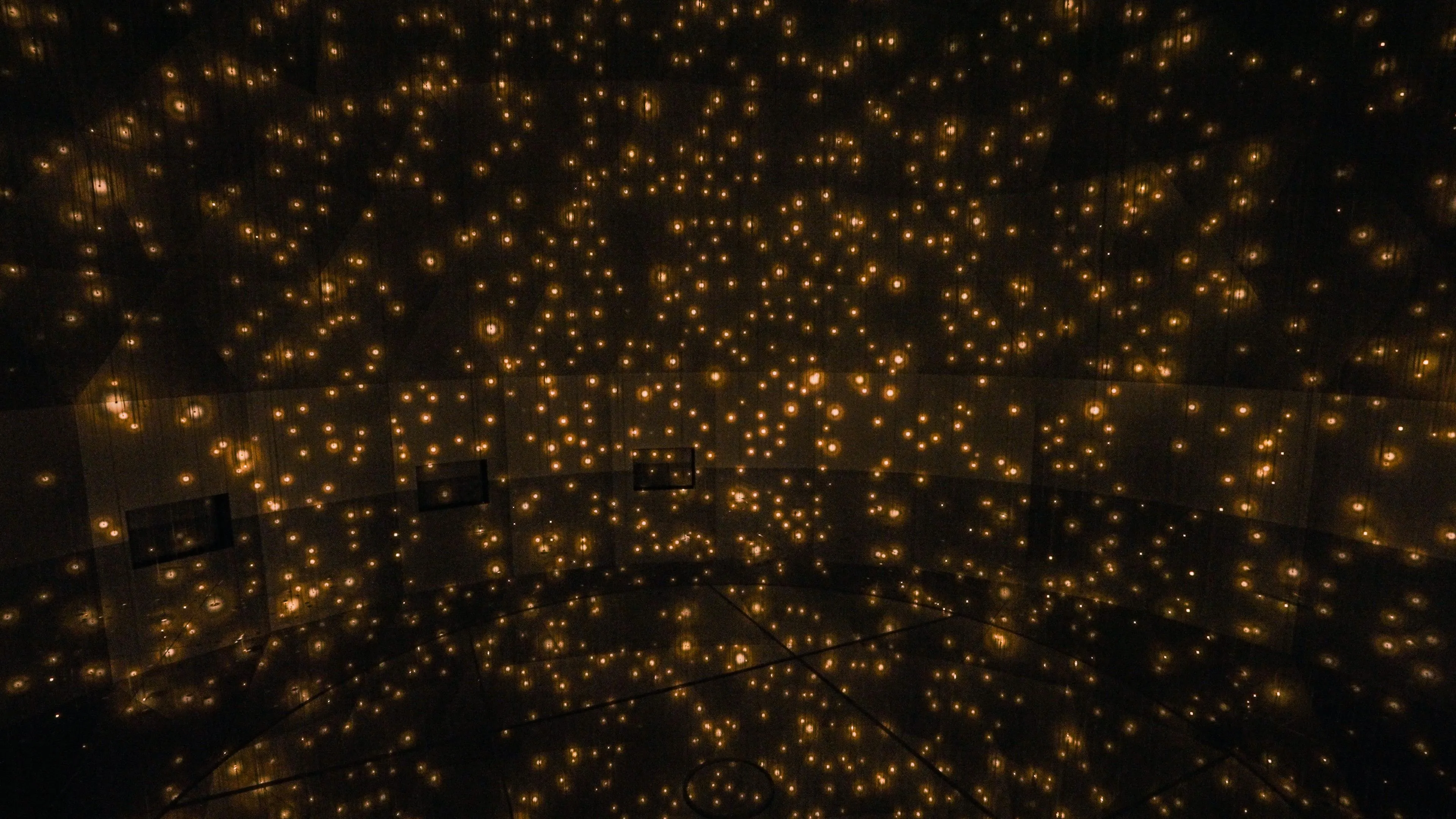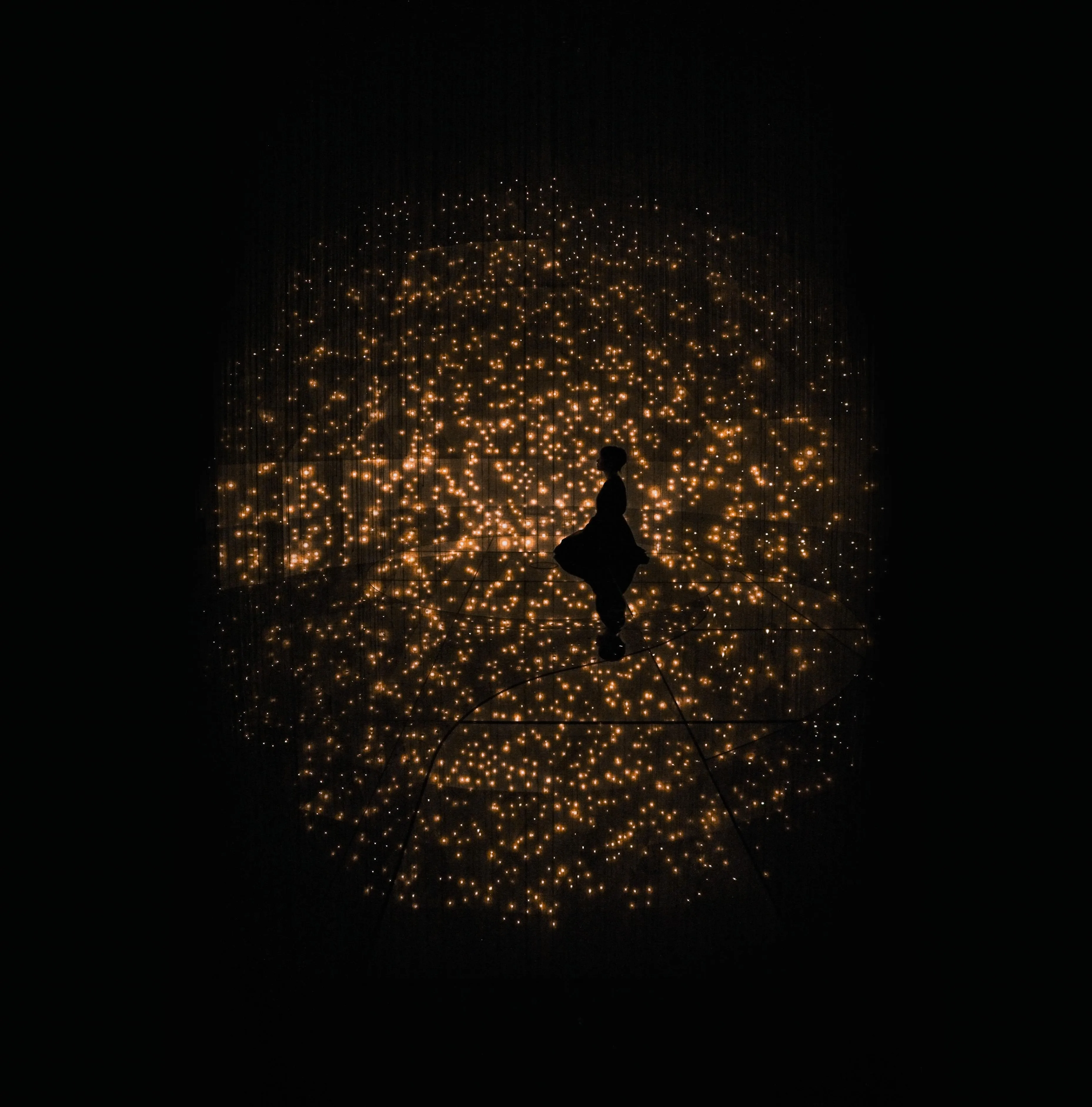 每一個光球,都仿佛是光凝固了之後形成的僅由光構成的團塊一般,在空間中能夠被清晰地感知,但卻沒有物質層面上的表面。人們對於作品與身體之間邊界的認知也是模糊的。拓寬視野後,仿佛是僅由黑暗形成的青紫色的黑暗球體開始在眼前浮現。