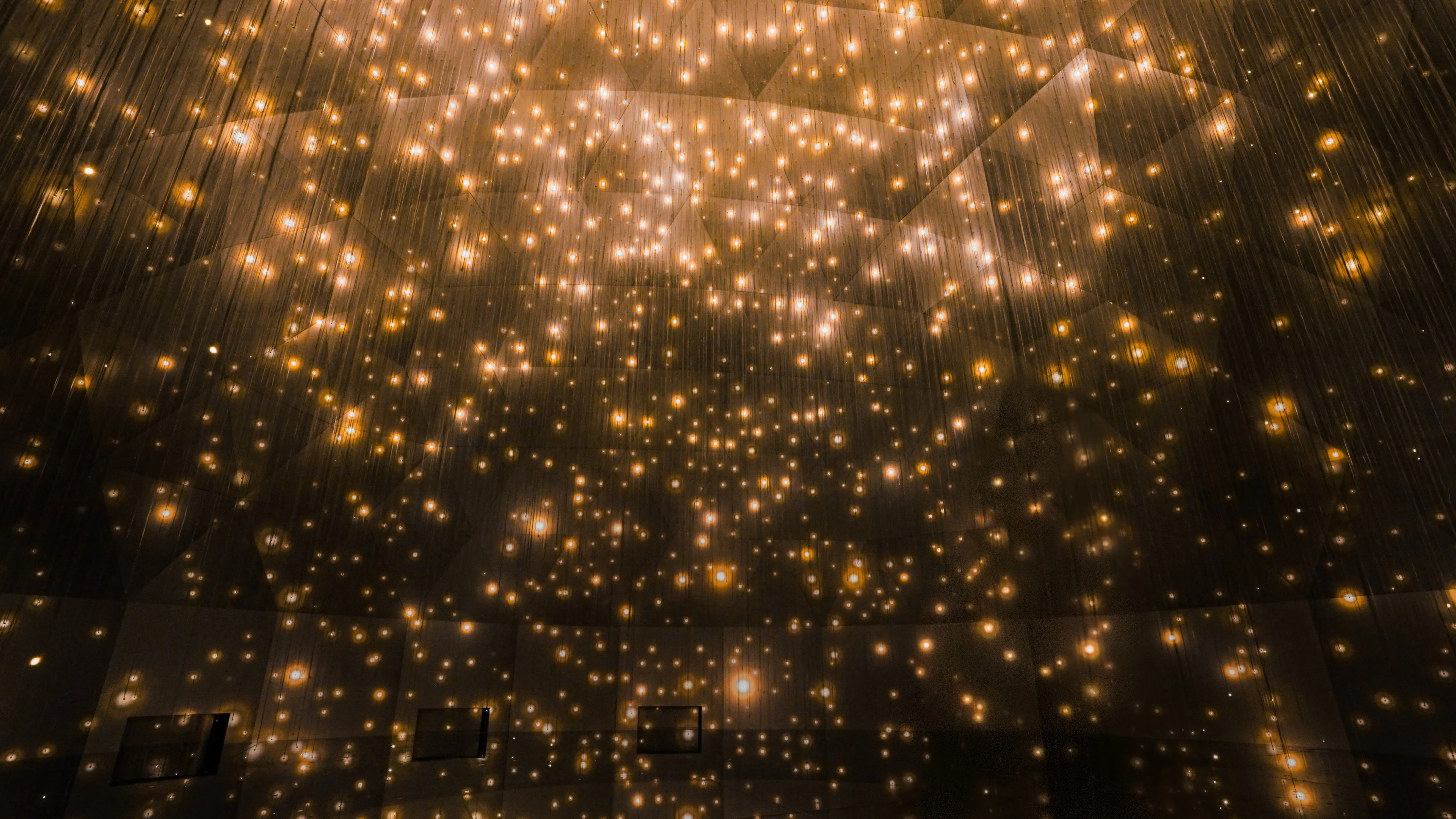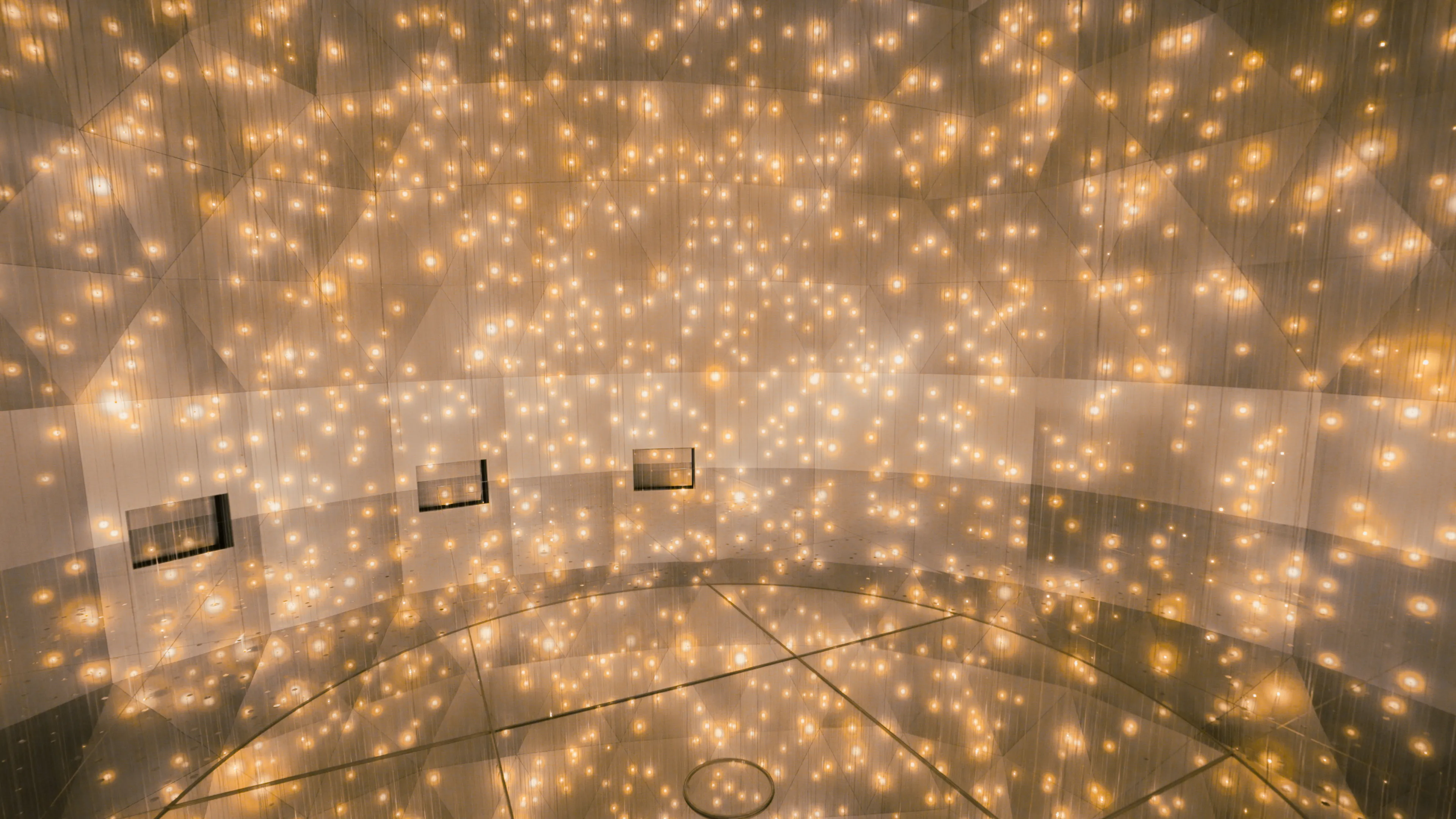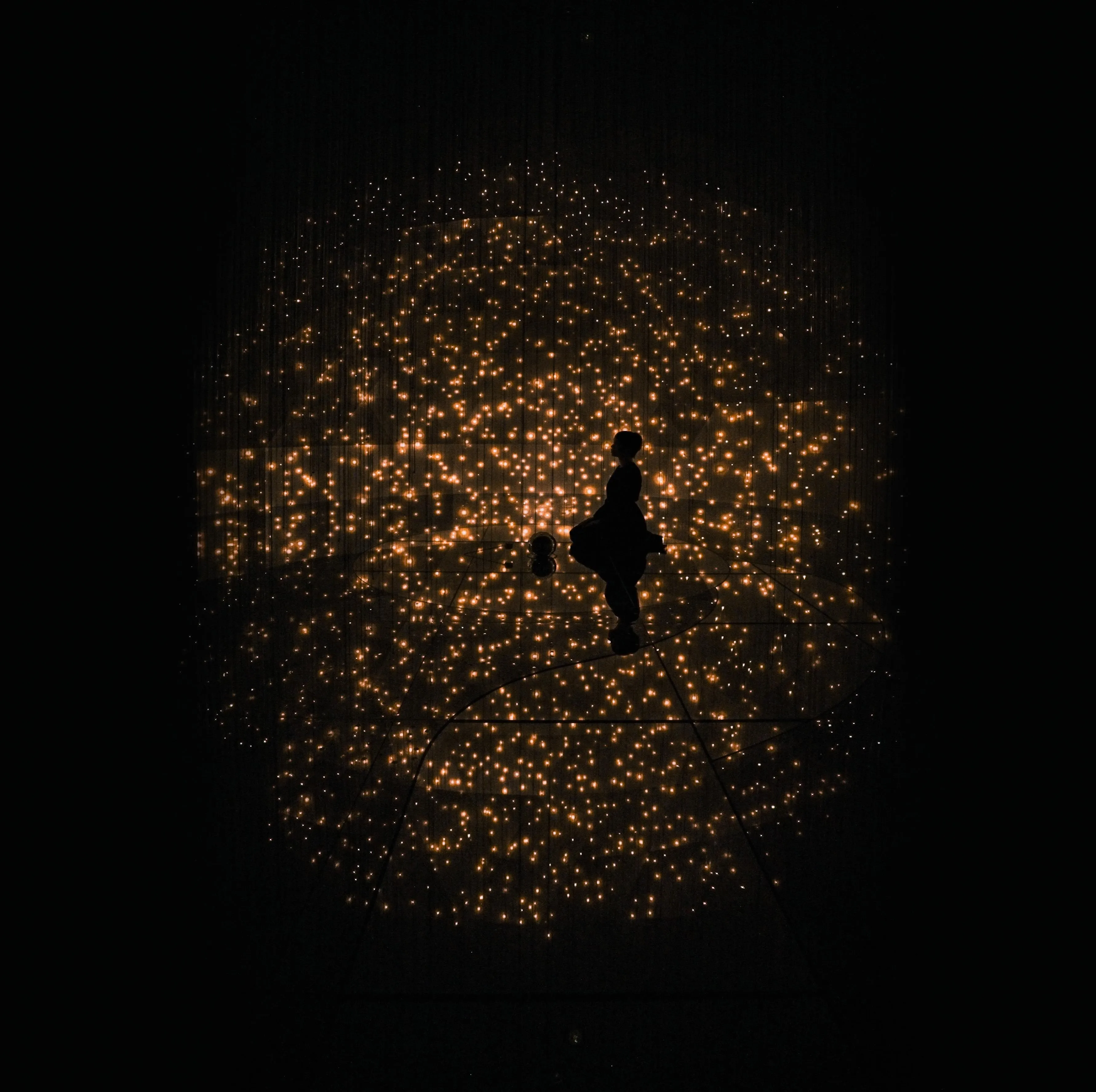每一個光球,都仿佛是光凝固了之後形成的僅由光構成的團塊一般,在空間中能夠被清晰地感知,但卻沒有物質層面上的表面。人們對於作品與身體之間邊界的認知也是模糊的。拓寬視野後,仿佛是僅由黑暗形成的青紫色的黑暗球體開始在眼前浮現。